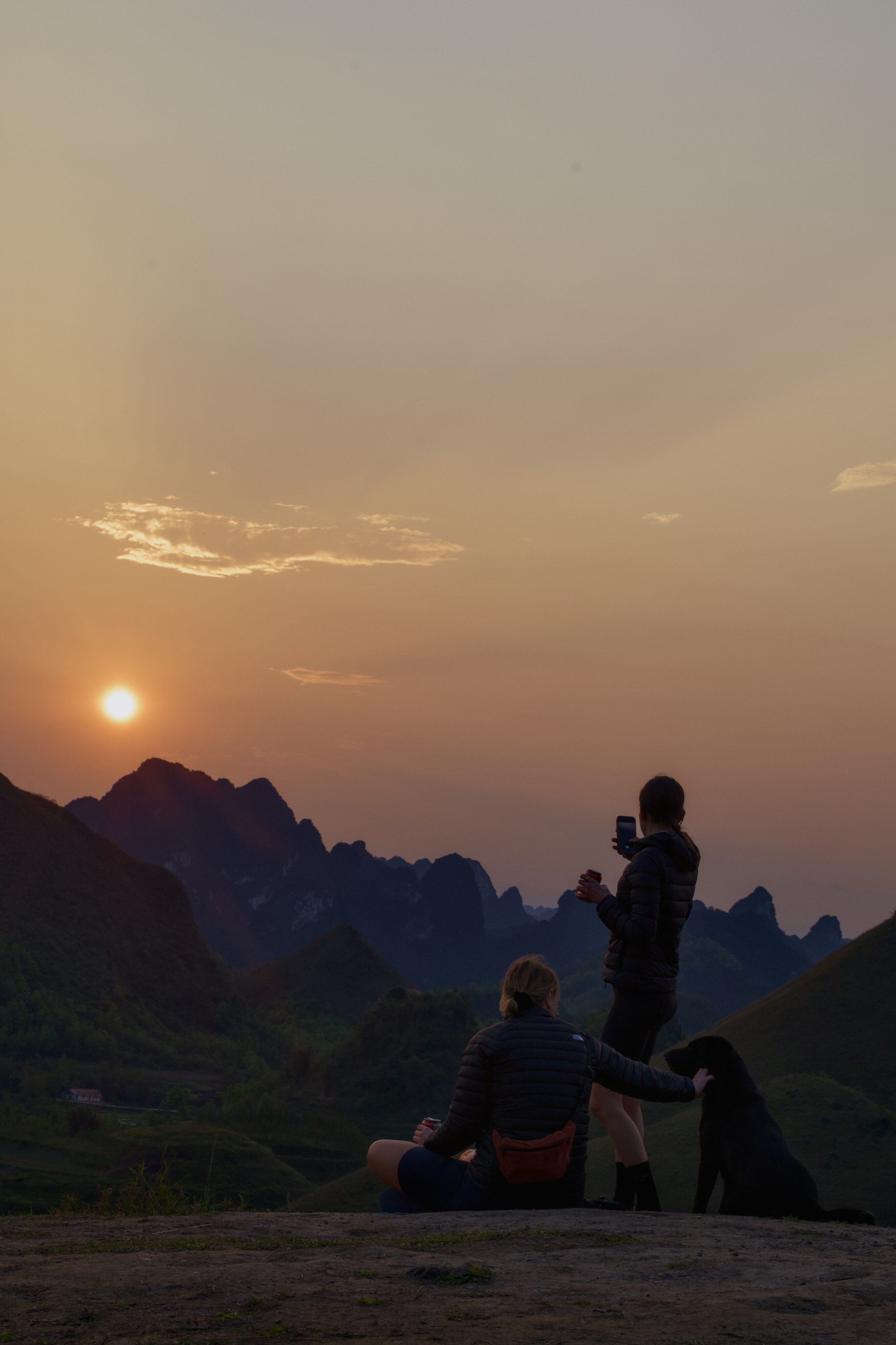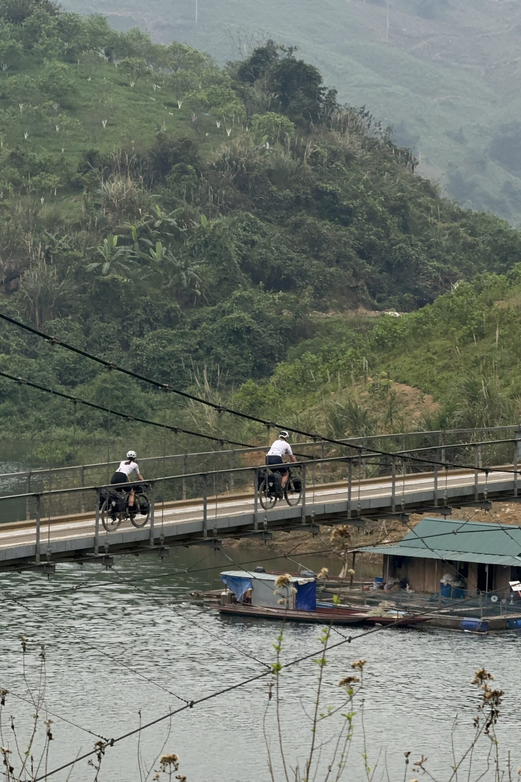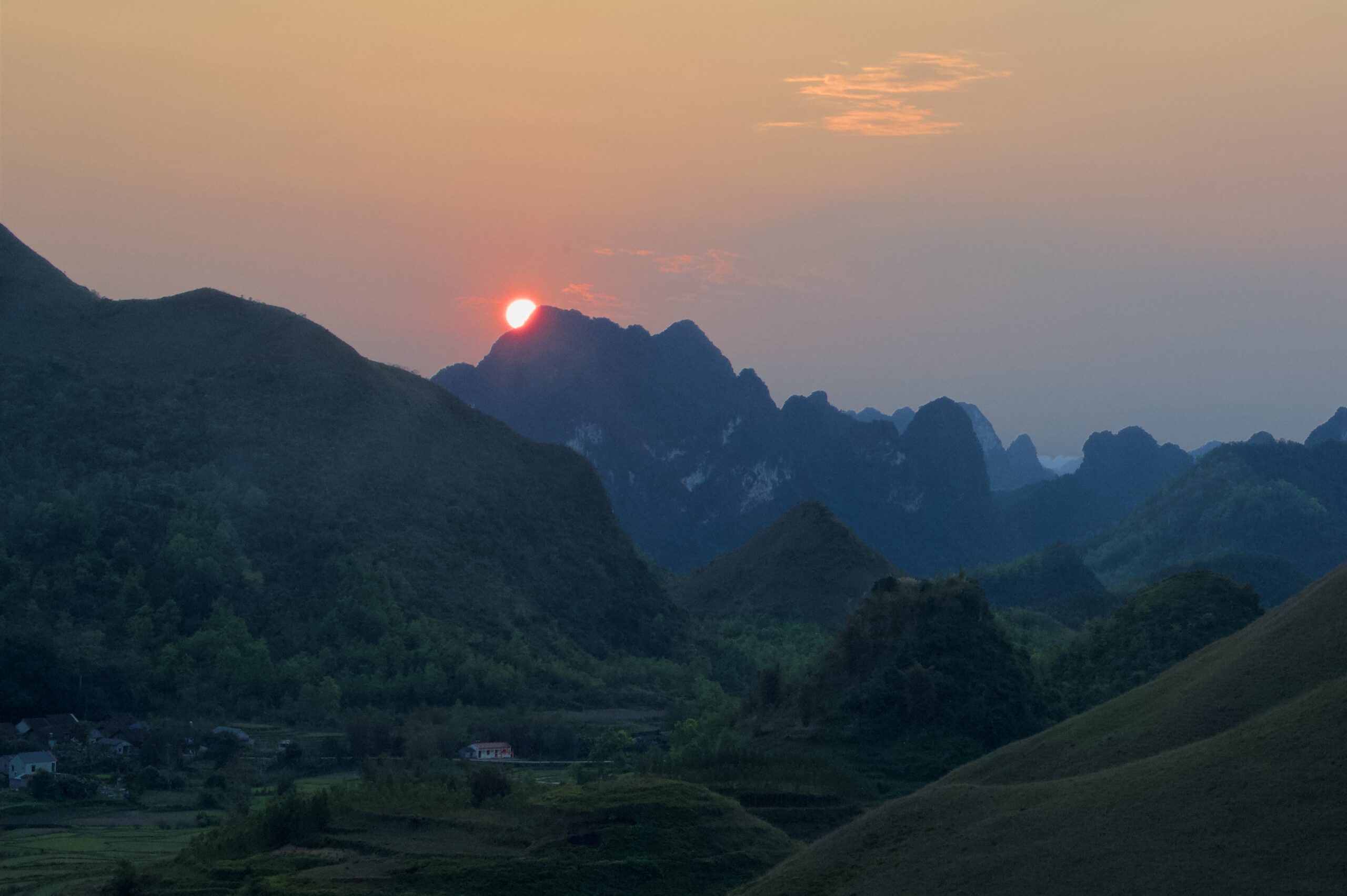 Die Route folgt zuerst noch eine Weile dem Grenzfluss bevor sie wieder ins Landesinnere von Vietnam abbiegt. Unsere Unterkunft liegt auf einem Karsthügel und wir wählen leider den schlechteren der beiden Wege die zur Hütte führen, den offiziellen Wanderweg. So müssen wir am Ende des Tages noch unsere Velos inklusive Gepäck hochstossen. Für die Aussicht hat sich der anstrengende Weg auf jeden Fall gelohnt, wir werden mit einem wunderschönen Sonnenuntergang belohnt.