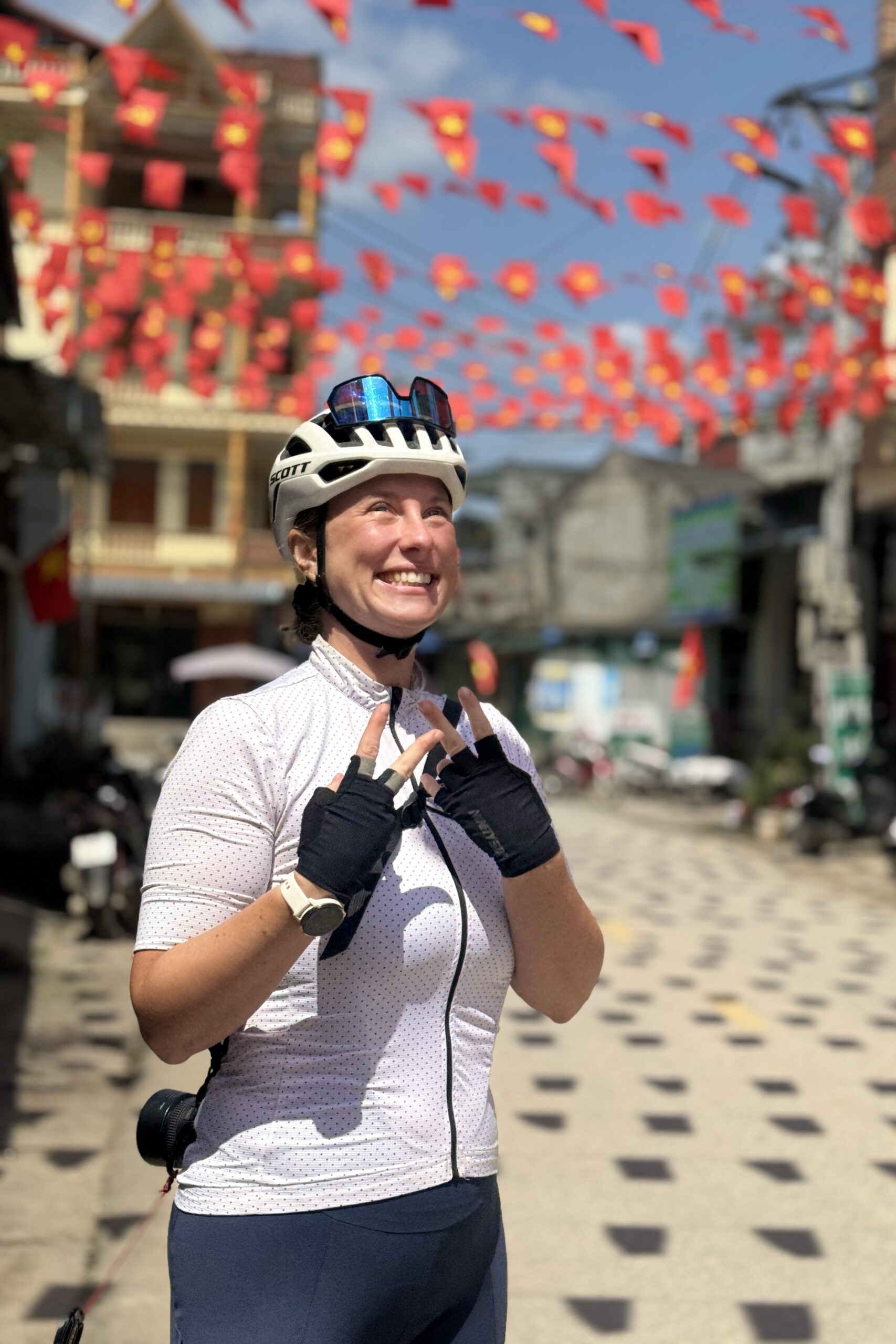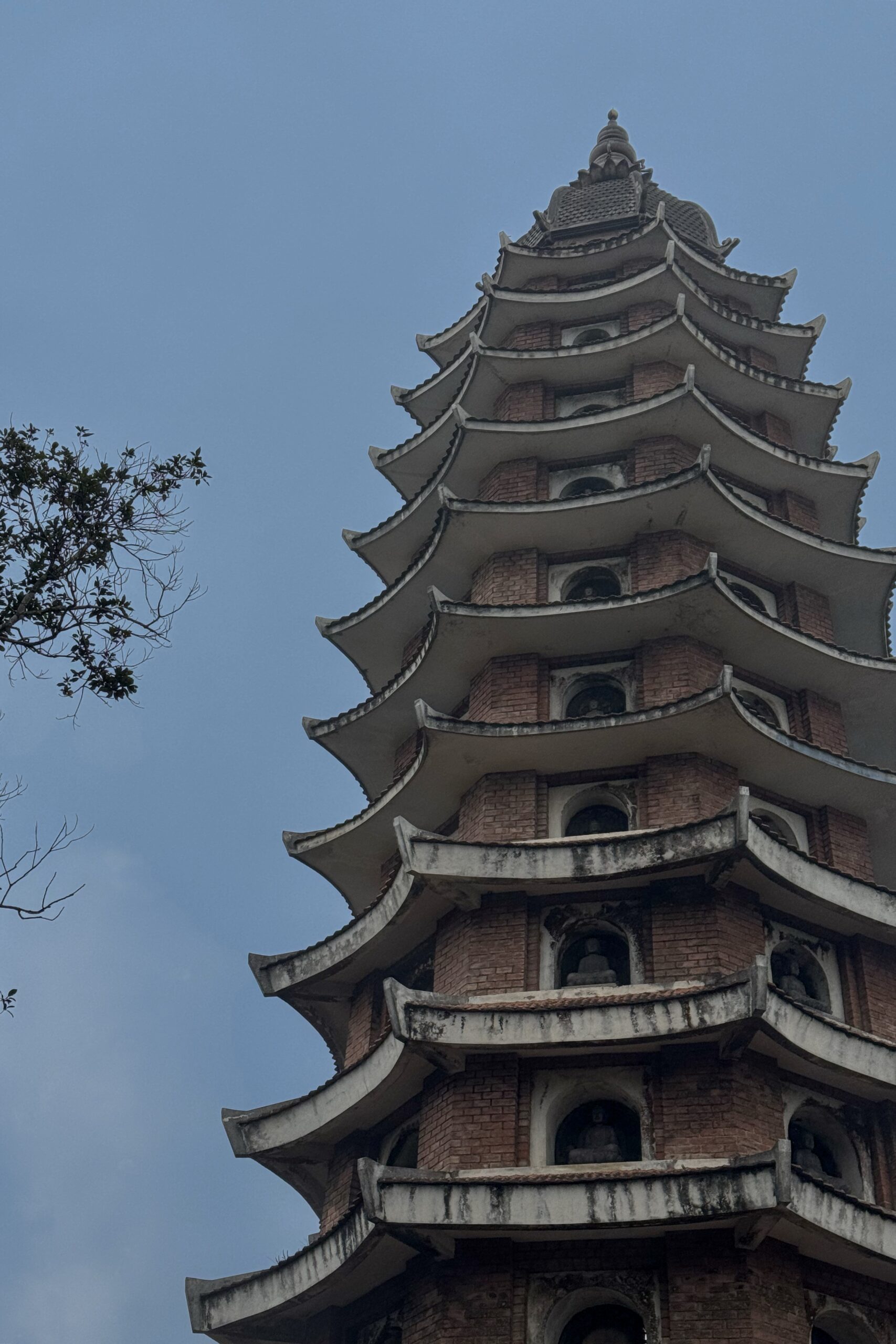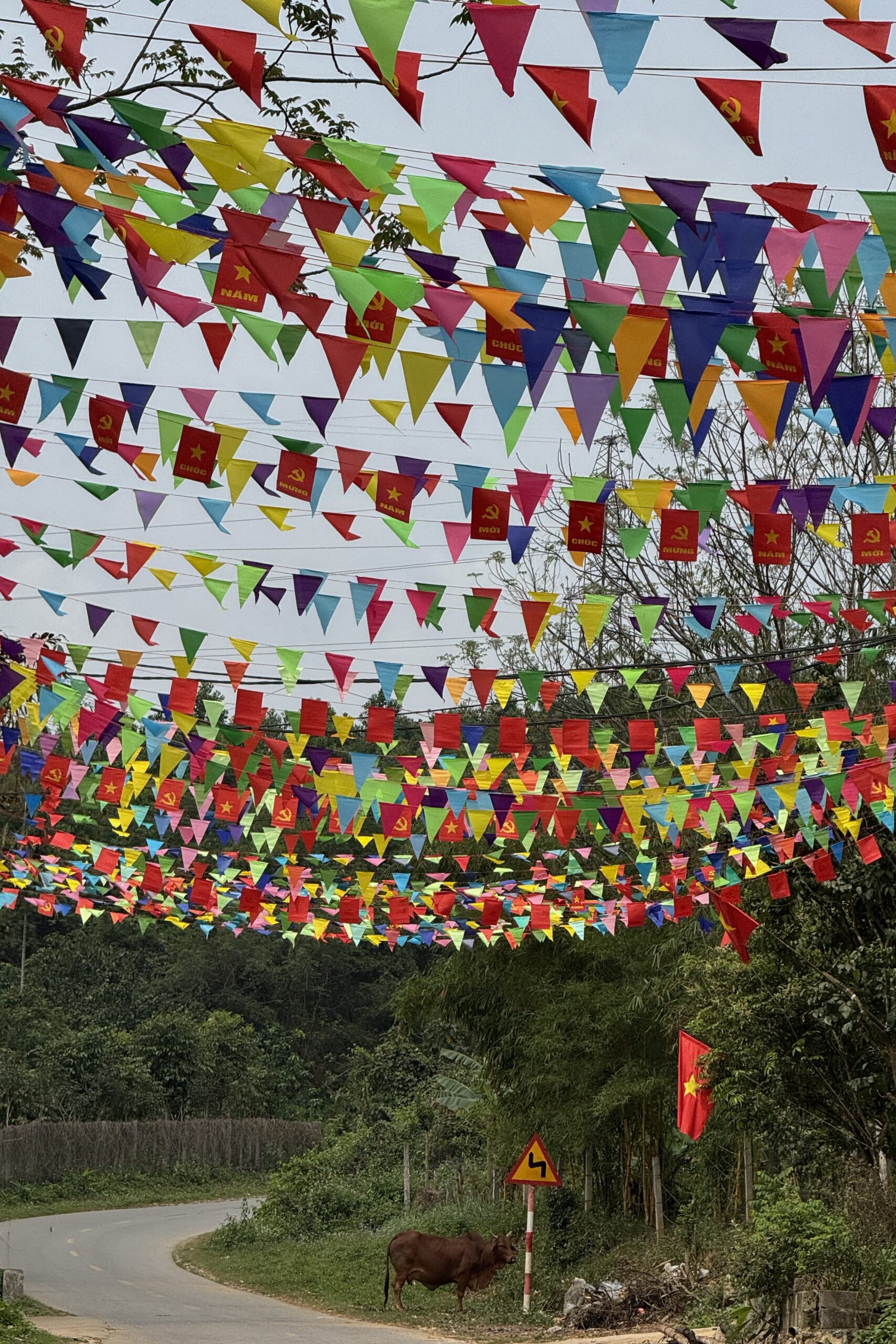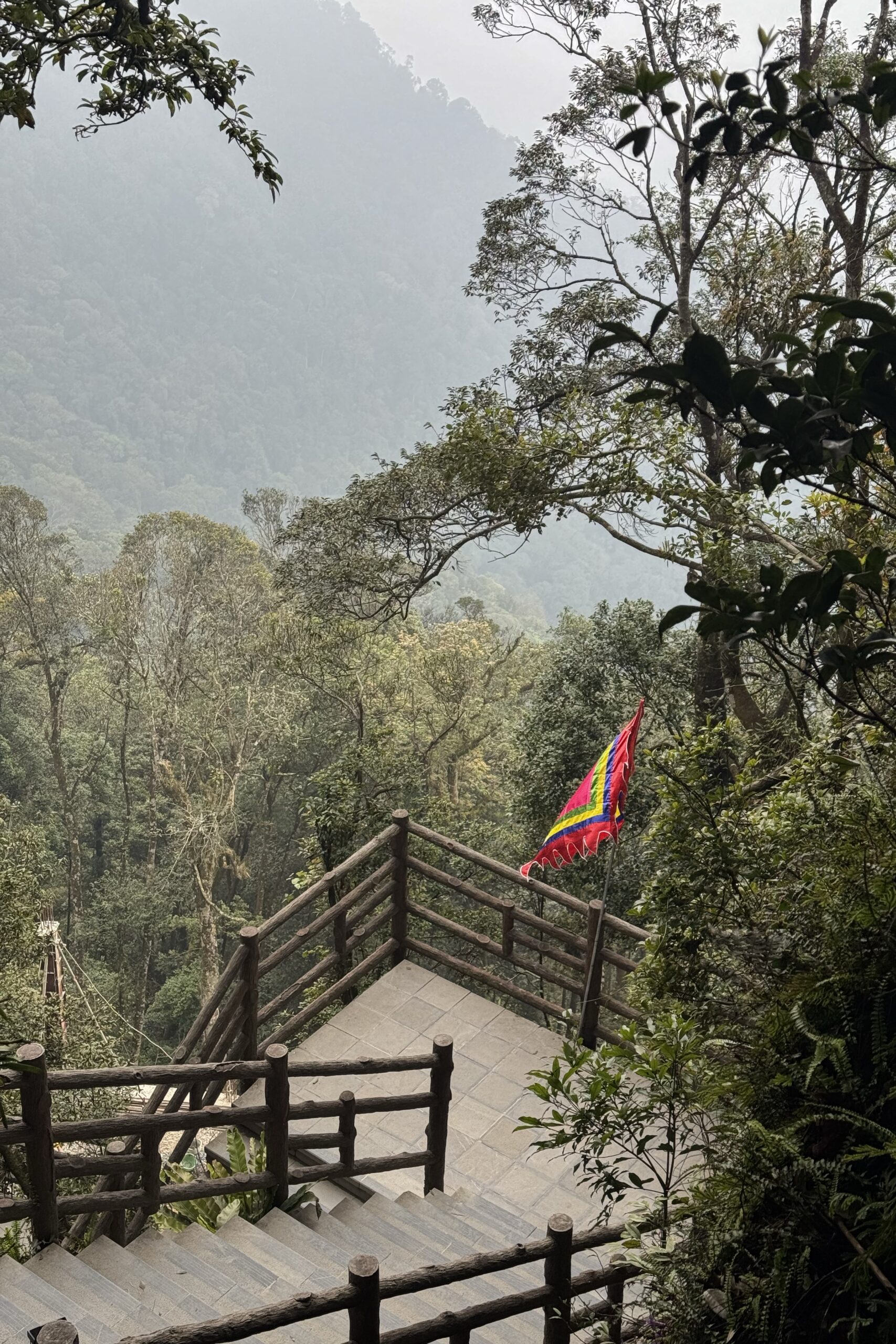 Von Mai Chau fahren wir Richtung Ba Vì, das nördlich von Hanoi liegt. Ein beliebtes Tagesausflugsziel von Hanoi aus. Unterwegs kommen wir an einer Crocs-Fabrik vorbei, ein auch in Vietnam sehr beliebter Schuh. Ansonsten haben wir während unserer Zeit in Vietnam weniger Produktionsstätten gesehen als erwartet. Bei Ba Vì ragen drei hohe Berge aus der flachen Ebene, wobei der höchste 1‘296 Meter hoch ist. Auf zwei der drei Gipfel stehen beeindruckende Tempel, einer davon ehrt Hồ Chi Minh. Um die beiden Tempel zu erreichen, müssen insgesamt 1’000 Treppenstufen erklommen werden. Begleitet wird der Aufstieg durch die Ballade von Hồ Chi Minh, die aus den Lautsprechern entlang der Treppe ertönt. Die Vietnames:innen erklimmen die Treppen mit Geschenken für den Altar und gewisse geniessen nach erfolgreichem Aufstieg ein ausgewogenes Mittagessen mit vietnamesischem Wein.