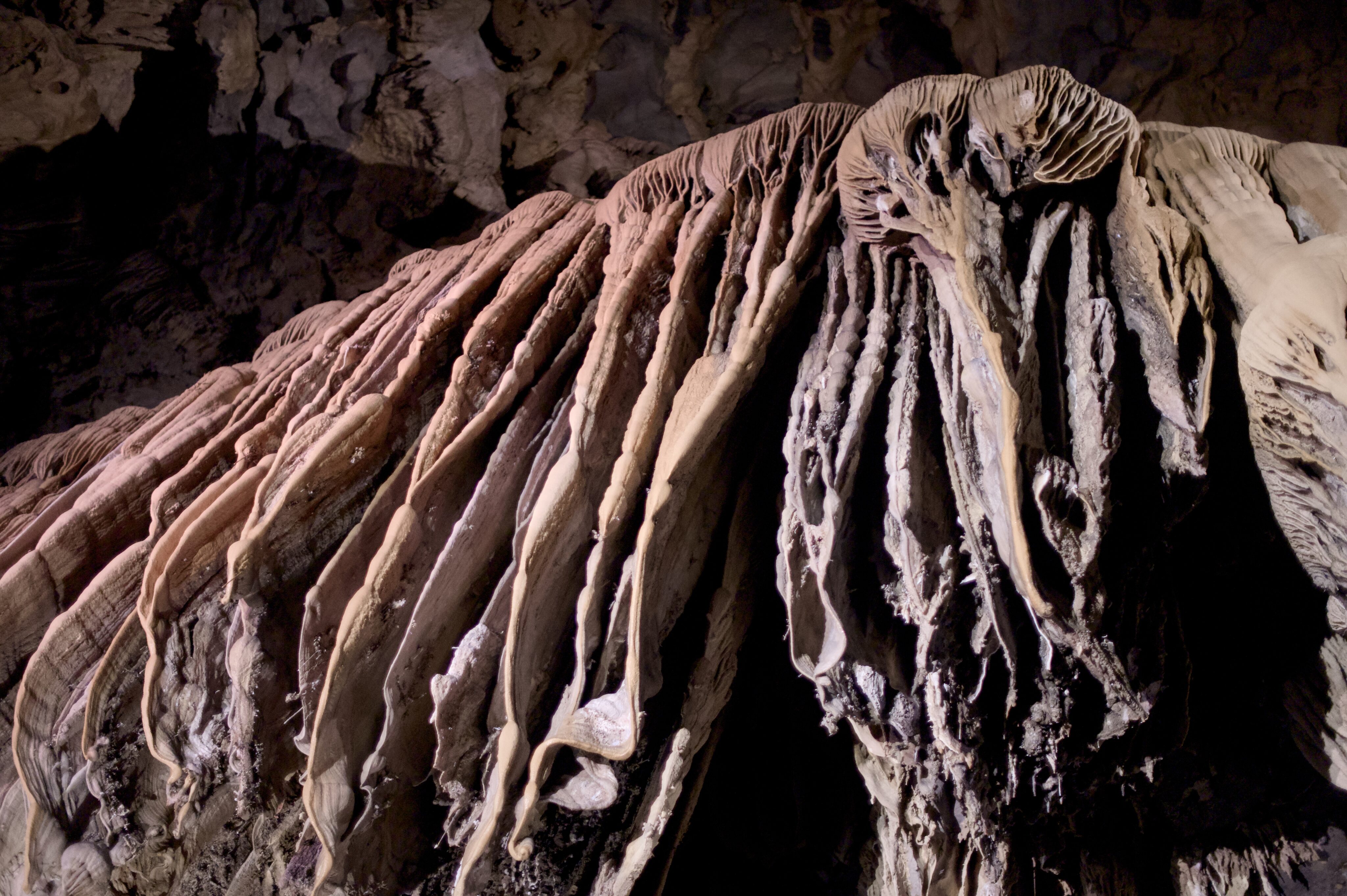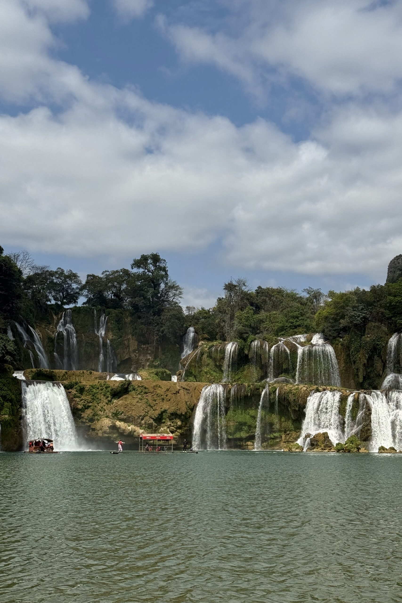 Cao Bằng ist ein deutlich lebendiger Ort als Ba Vì und der Ausgangsort für viele Tagestouren in der Region. Das schlechte Wetter kommt leider mit uns mit, so fahren wir am ersten Tag im Regen Richtung chinesische Grenze. Auch hier ist die Region stark durch die Karstlandschaft geprägt, die Häuser erinnern einem aber eher an das ländliche China und unterscheiden sich stark von jenen im Nordwesten von Vietnam. Wir besuchen eine der vielen Karsthöhlen der Region und bestaunen die riesigen Stalaktiten und Stalagmiten. Die höchste der zusammenhängenden Höhlen ist 60 Meter hoch. Beeindruckende Dimensionen und Formen, die wir in einer 1,5-stündigen Führung bestaunen. Die Nacht verbringen wir direkt an der Grenze und besuchen am nächsten Tag bei schönstem Wetter den wunderschönen Wasserfall, Bản Giốc, der die Grenze zwischen China und Vietnam bildet. Zu unserem Erstauen hat es auf beiden Seiten keine gross sichtbare Militärpräsenz und es fahren von beiden Seiten die gleichen Boote in die Nähe des Wasserfalls.