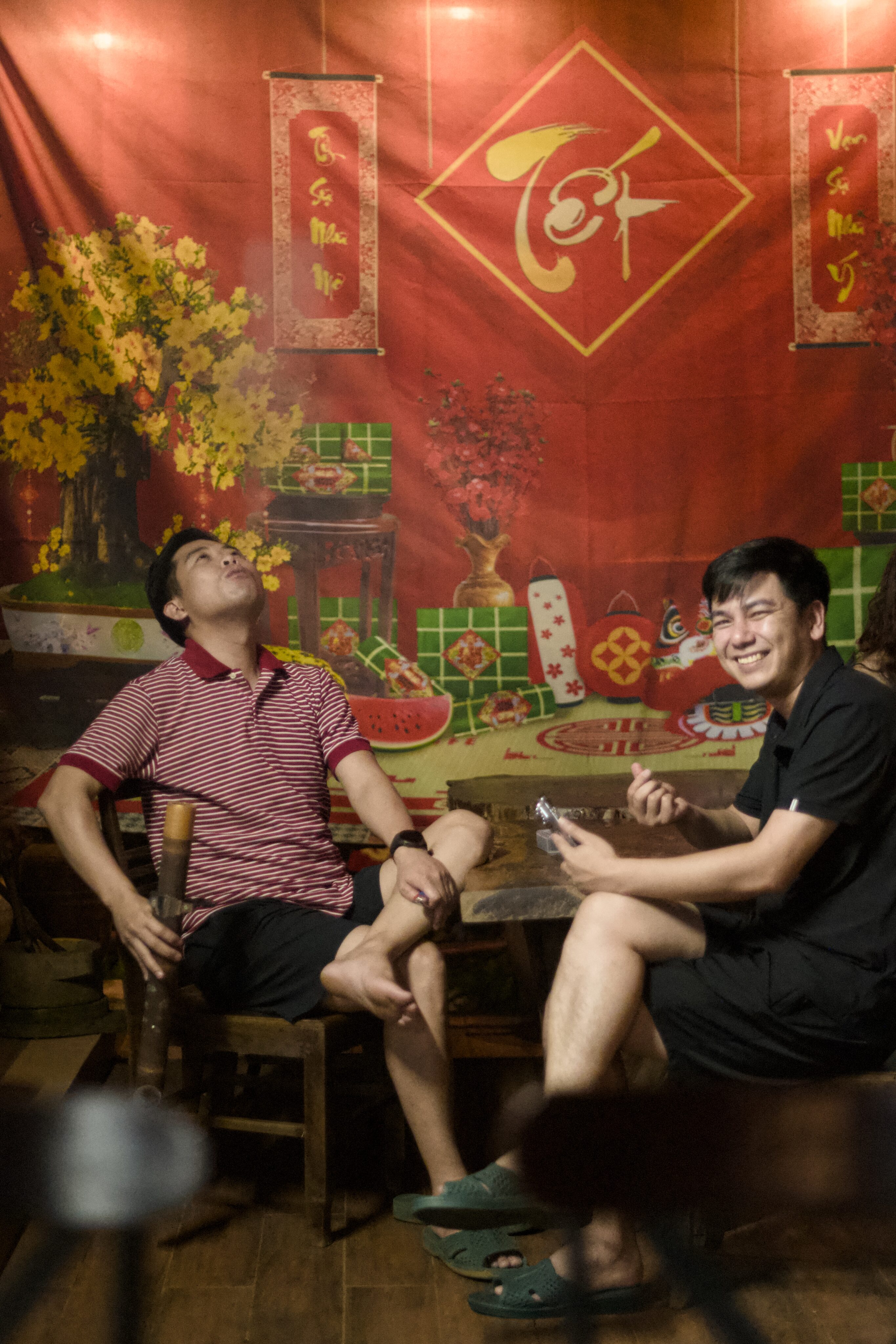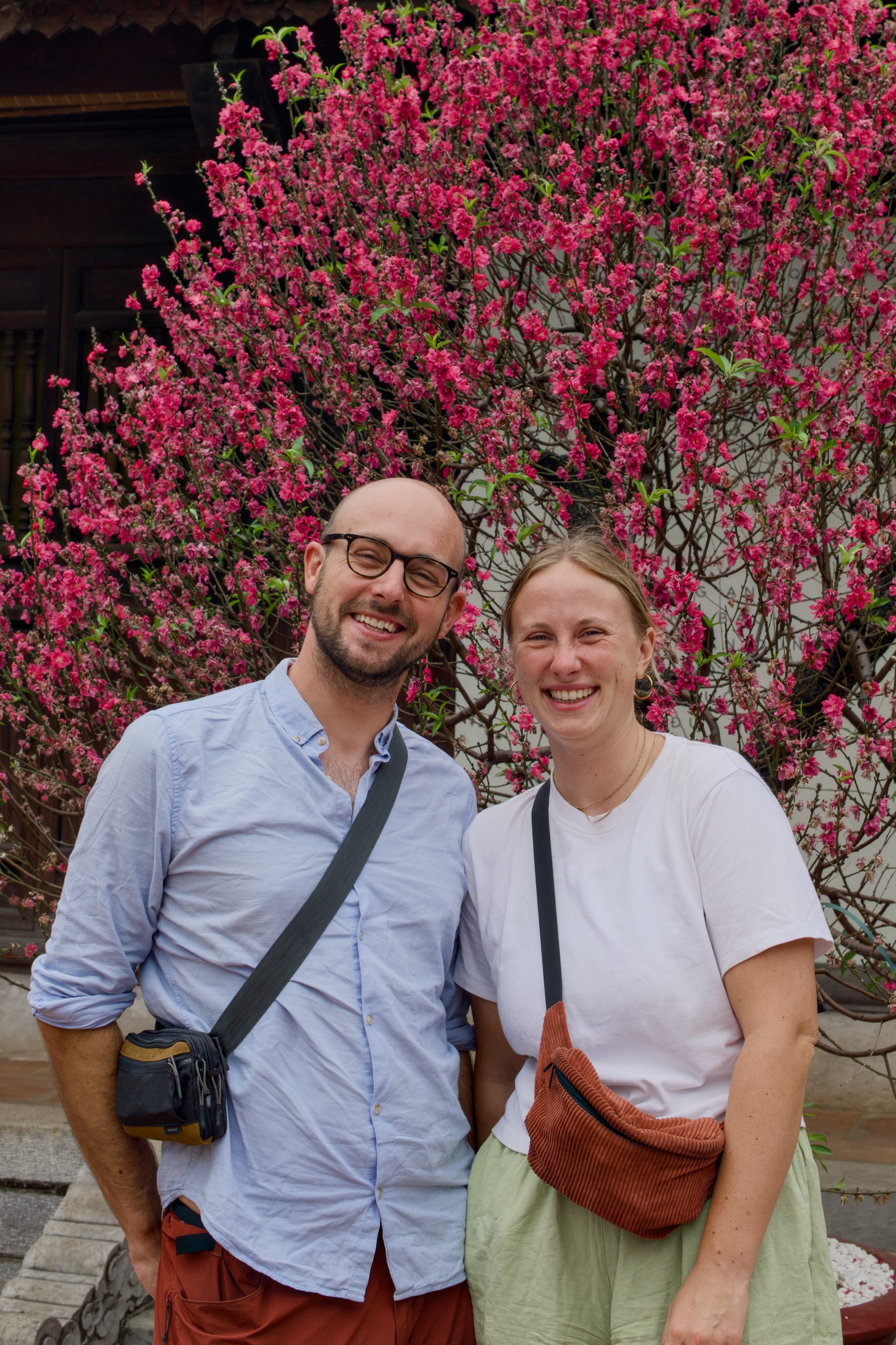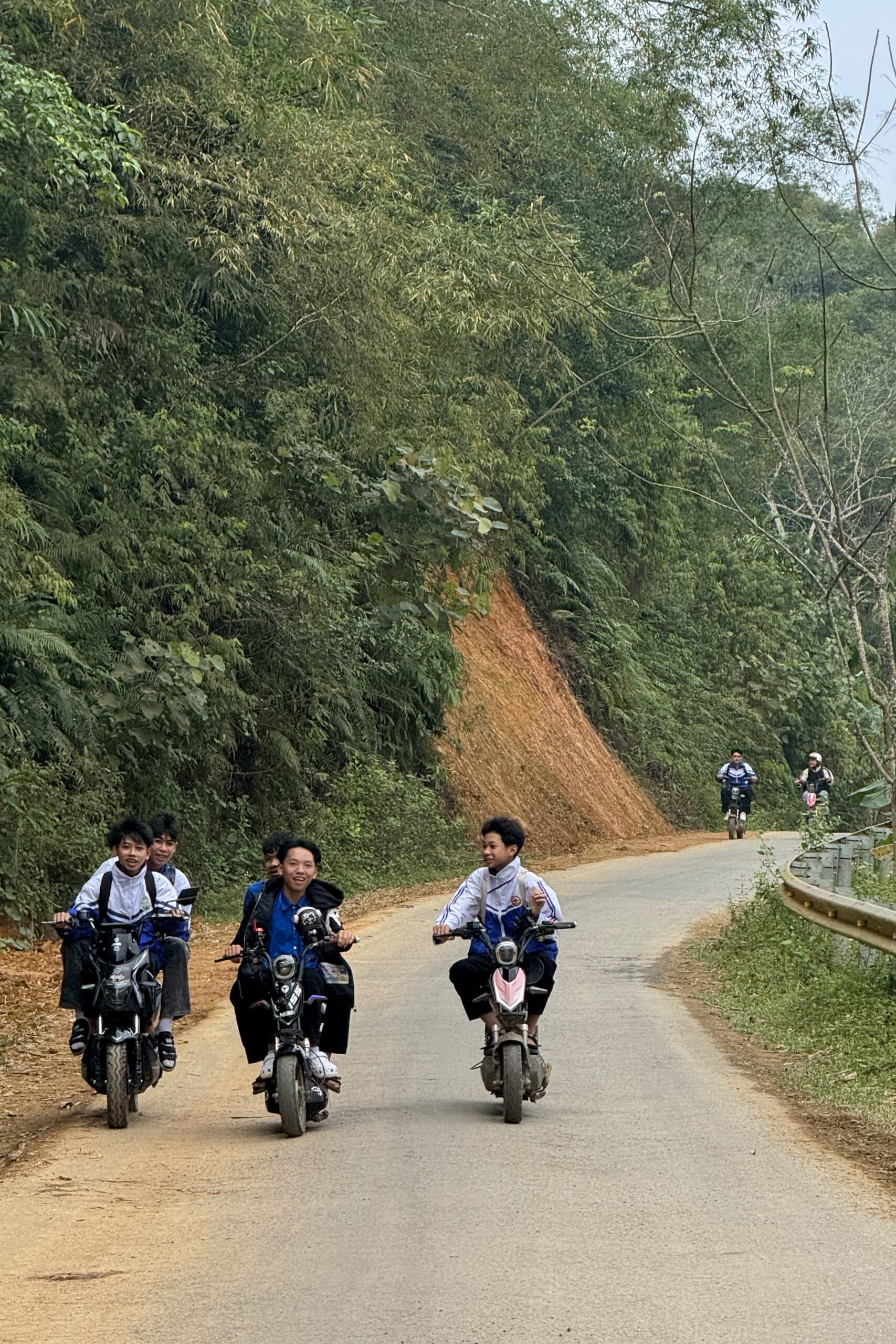 Von Mai Chau fahren wir Richtung Ba Vì, das nördlich von Hanoi liegt. Ein beliebtes Tagesausflugsziel von Hanoi aus. Unterwegs kommen wir an einer Crocs-Fabrik vorbei, ein auch in Vietnam sehr beliebter Schuh. Ansonsten haben wir während unserer Zeit in Vietnam weniger Produktionsstätten gesehen als erwartet. Bei Ba Vì ragen drei hohe Berge aus der flachen Ebene, wobei der höchste 1‘296 Meter hoch ist. Auf zwei der drei Gipfel stehen beeindruckende Tempel, einer davon ehrt Hồ Chi Minh. Um die beiden Tempel zu erreichen, müssen insgesamt 1’000 Treppenstufen erklommen werden. Begleitet wird der Aufstieg durch die Ballade von Hồ Chi Minh, die aus den Lautsprechern entlang der Treppe ertönt. Die Vietnames:innen erklimmen die Treppen mit Geschenken für den Altar und gewisse geniessen nach erfolgreichem Aufstieg ein ausgewogenes Mittagessen mit vietnamesischem Wein.