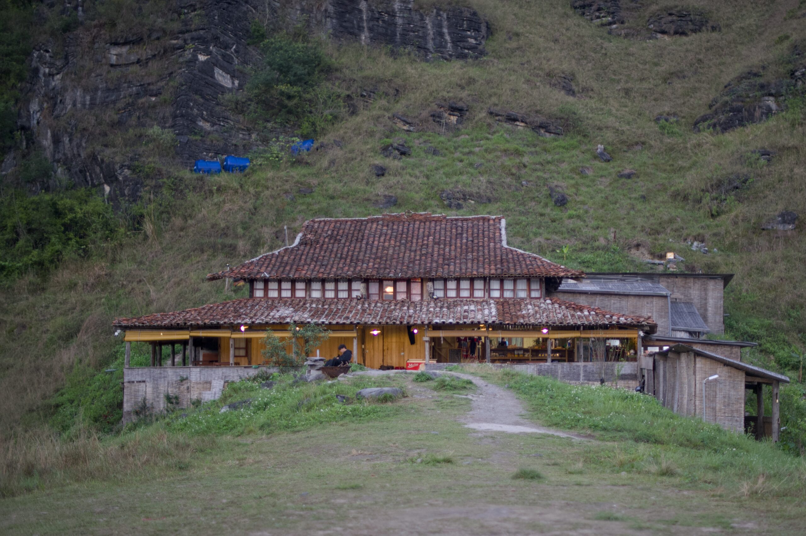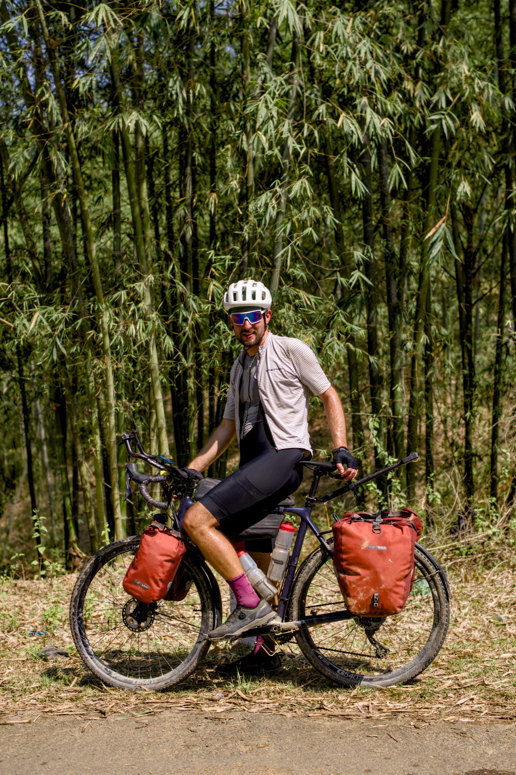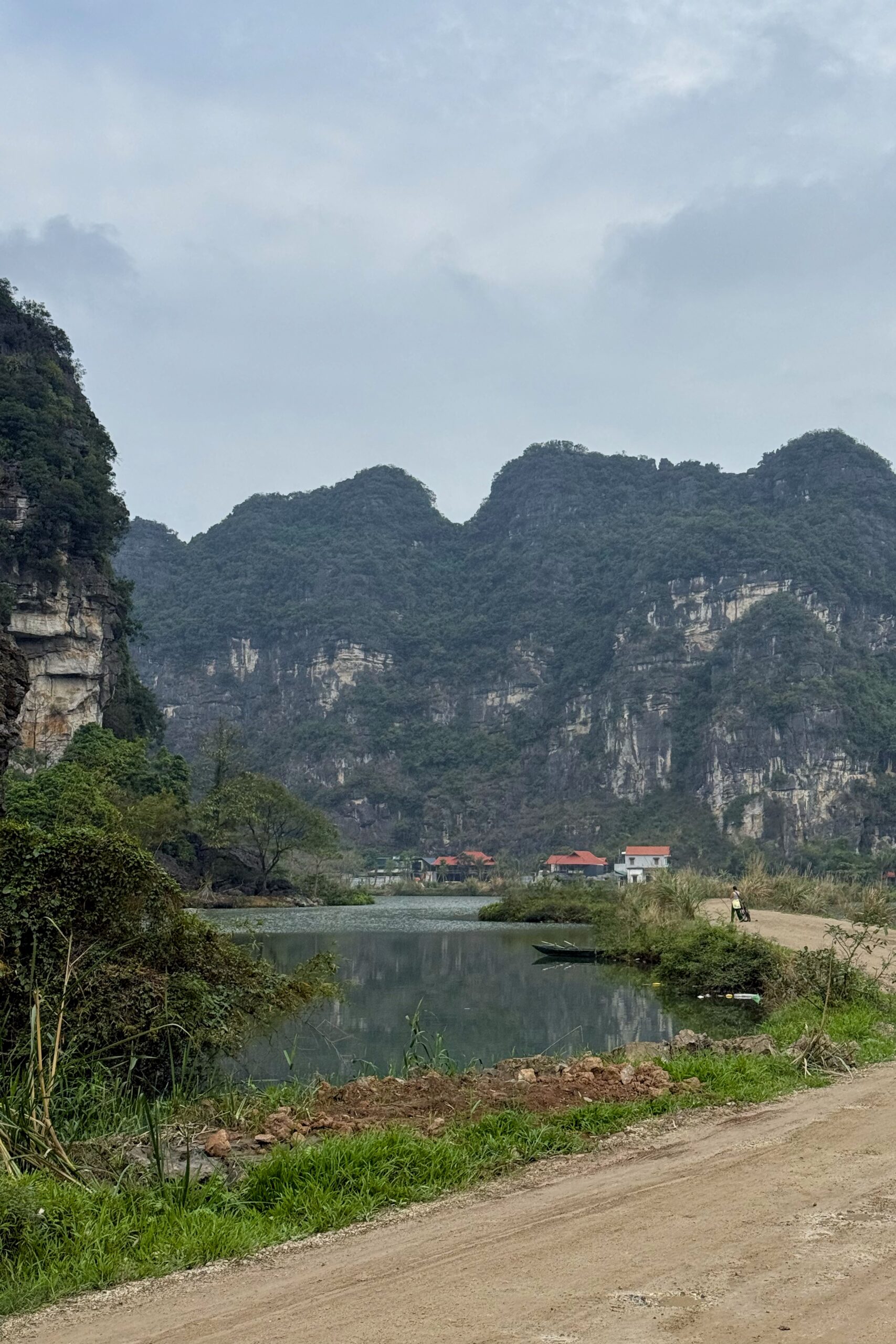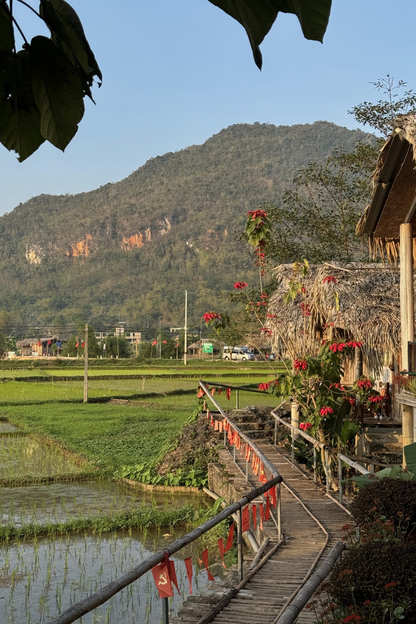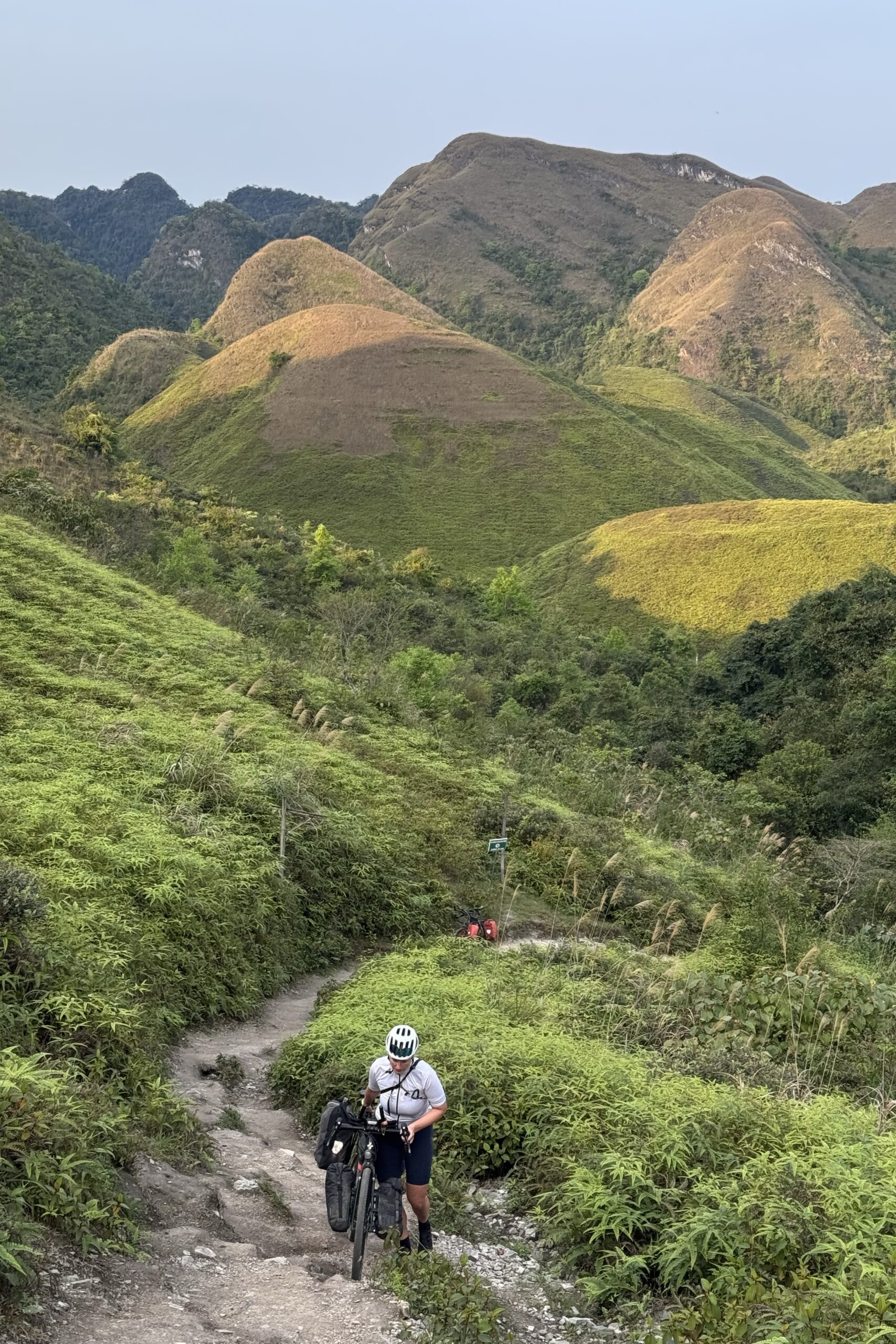 Die Route folgt zuerst noch eine Weile dem Grenzfluss bevor sie wieder ins Landesinnere von Vietnam abbiegt. Unsere Unterkunft liegt auf einem Karsthügel und wir wählen leider den schlechteren der beiden Wege die zur Hütte führen, den offiziellen Wanderweg. So müssen wir am Ende des Tages noch unsere Velos inklusive Gepäck hochstossen. Für die Aussicht hat sich der anstrengende Weg auf jeden Fall gelohnt, wir werden mit einem wunderschönen Sonnenuntergang belohnt.