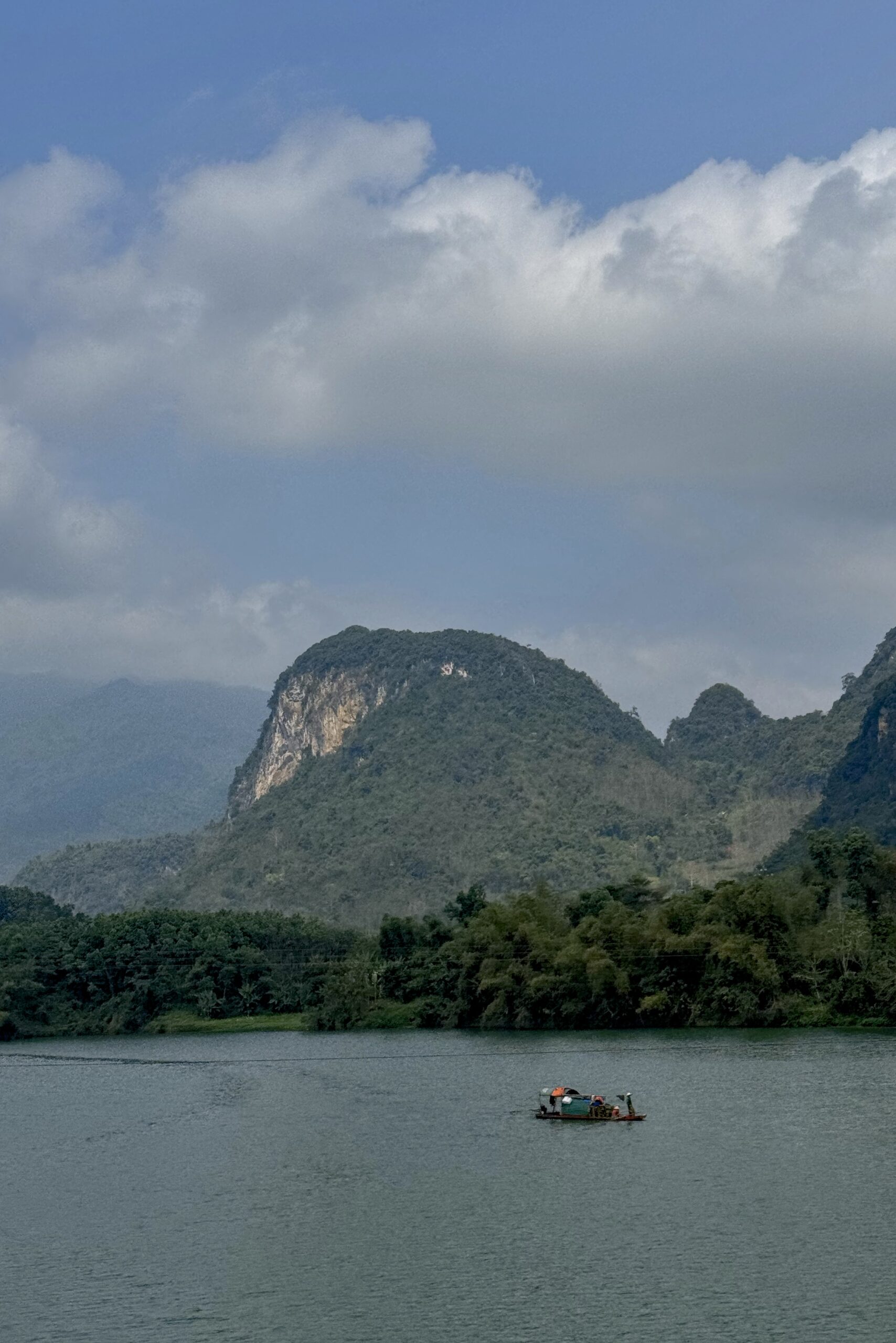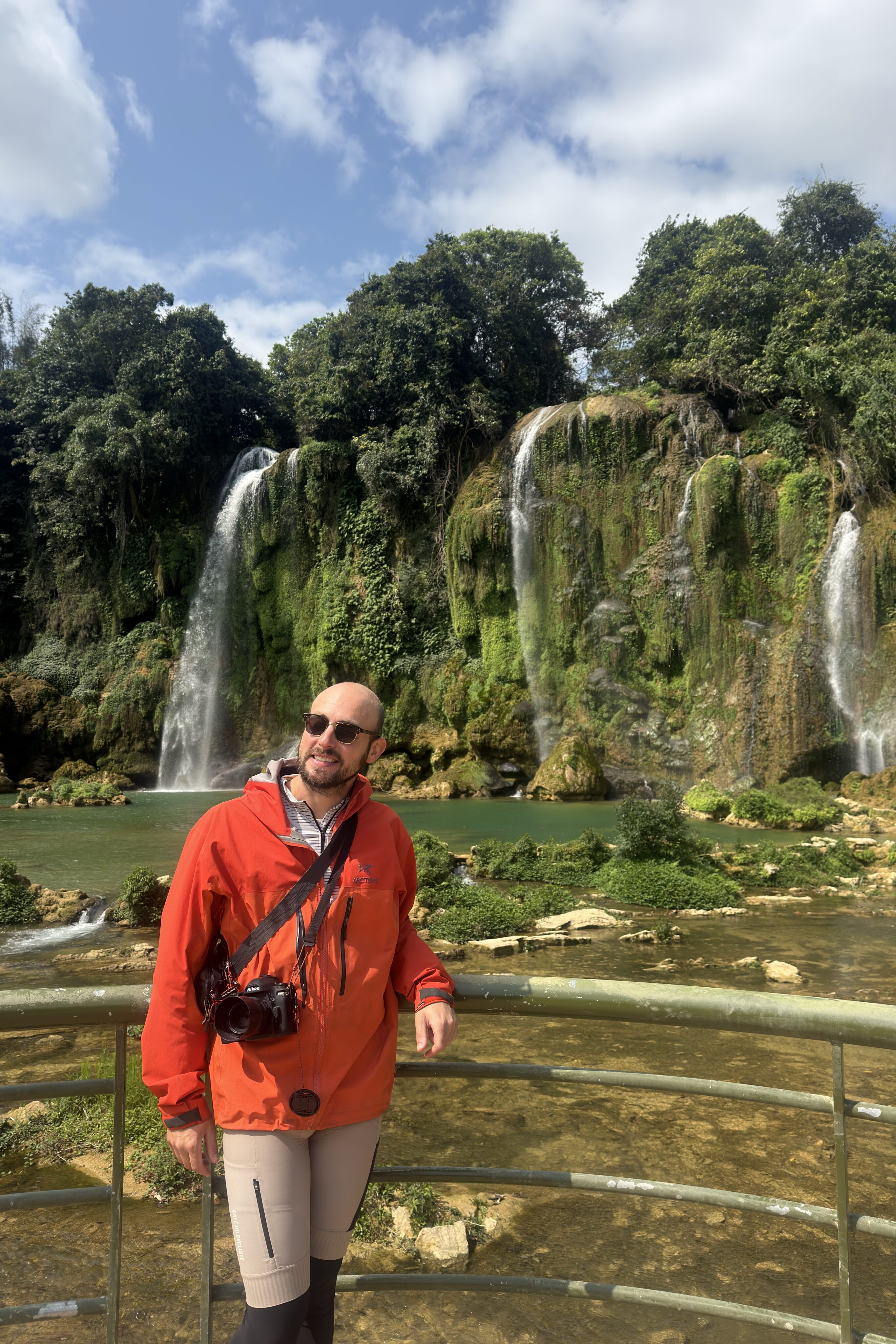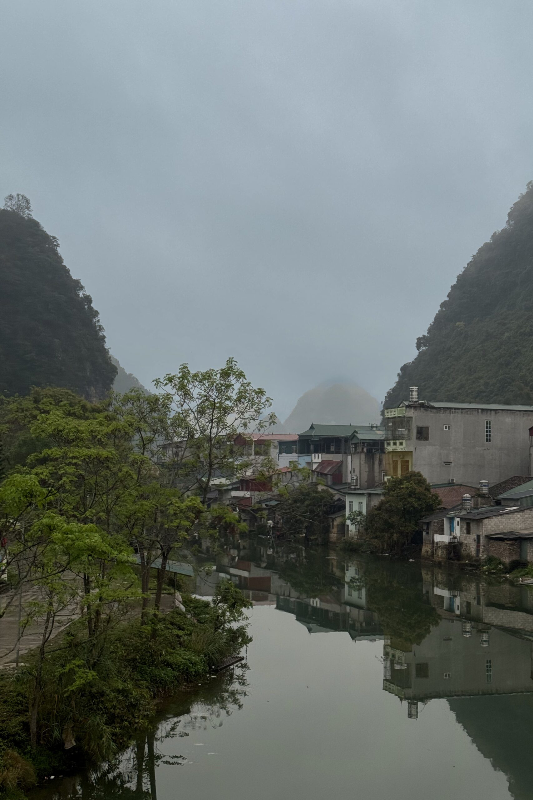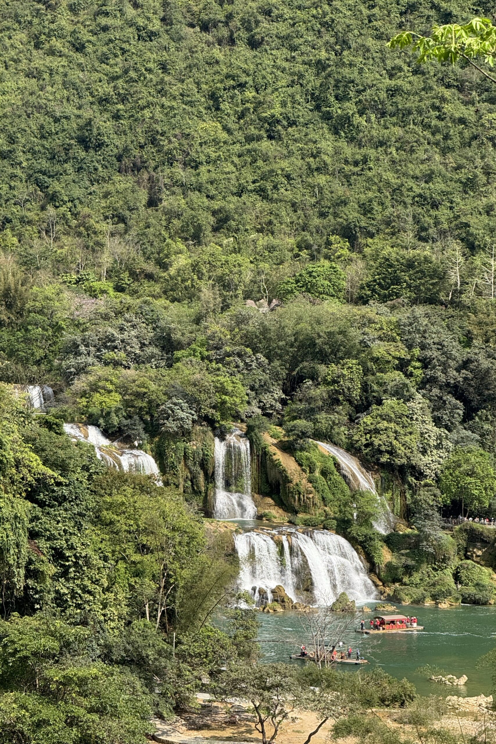 Cao Bằng ist ein deutlich lebendiger Ort als Ba Vì und der Ausgangsort für viele Tagestouren in der Region. Das schlechte Wetter kommt leider mit uns mit, so fahren wir am ersten Tag im Regen Richtung chinesische Grenze. Auch hier ist die Region stark durch die Karstlandschaft geprägt, die Häuser erinnern einem aber eher an das ländliche China und unterscheiden sich stark von jenen im Nordwesten von Vietnam. Wir besuchen eine der vielen Karsthöhlen der Region und bestaunen die riesigen Stalaktiten und Stalagmiten. Die höchste der zusammenhängenden Höhlen ist 60 Meter hoch. Beeindruckende Dimensionen und Formen, die wir in einer 1,5-stündigen Führung bestaunen. Die Nacht verbringen wir direkt an der Grenze und besuchen am nächsten Tag bei schönstem Wetter den wunderschönen Wasserfall, Bản Giốc, der die Grenze zwischen China und Vietnam bildet. Zu unserem Erstauen hat es auf beiden Seiten keine gross sichtbare Militärpräsenz und es fahren von beiden Seiten die gleichen Boote in die Nähe des Wasserfalls.