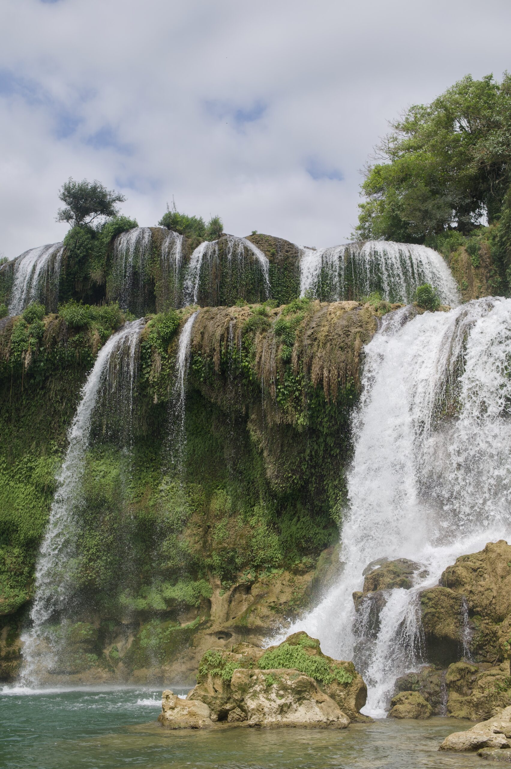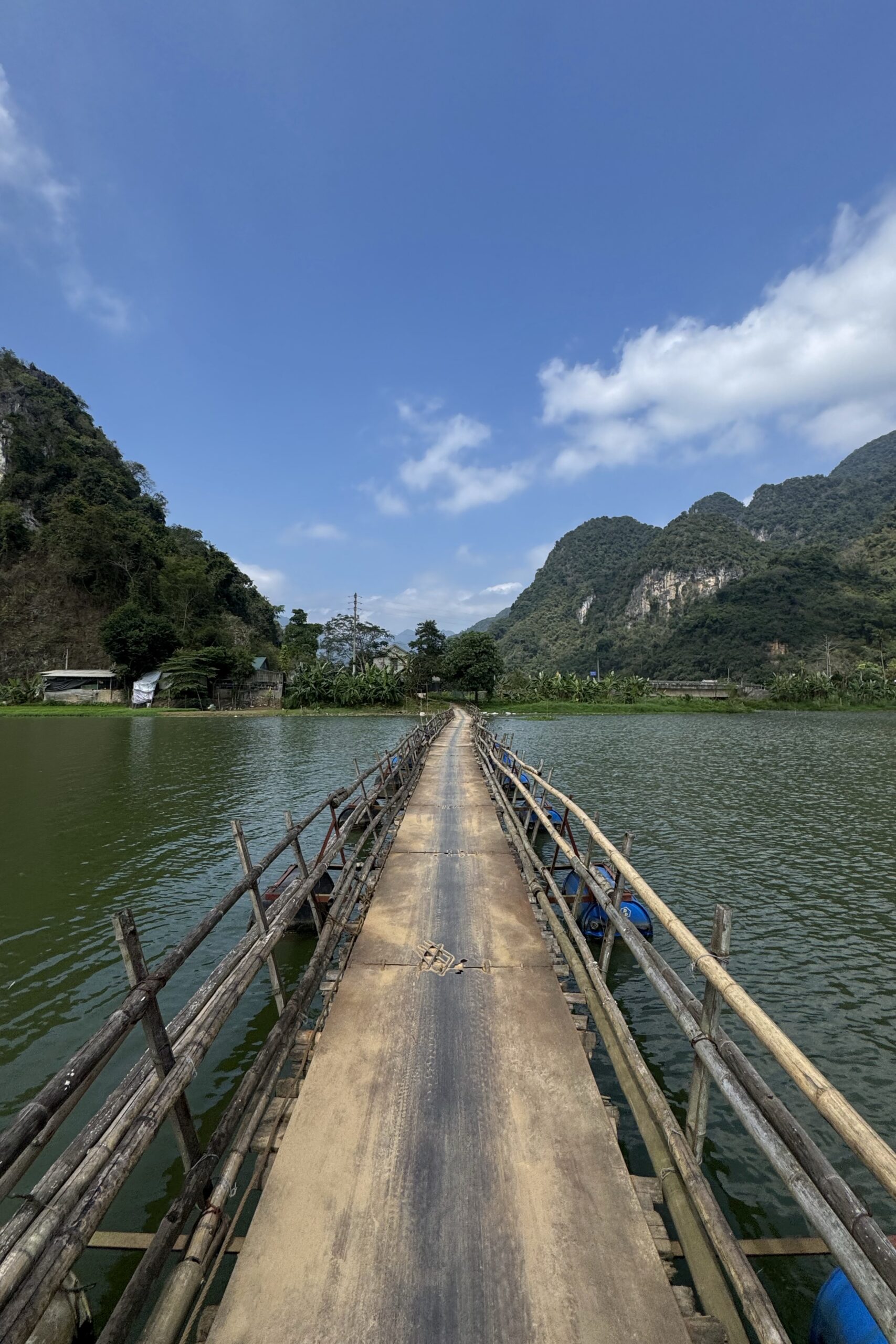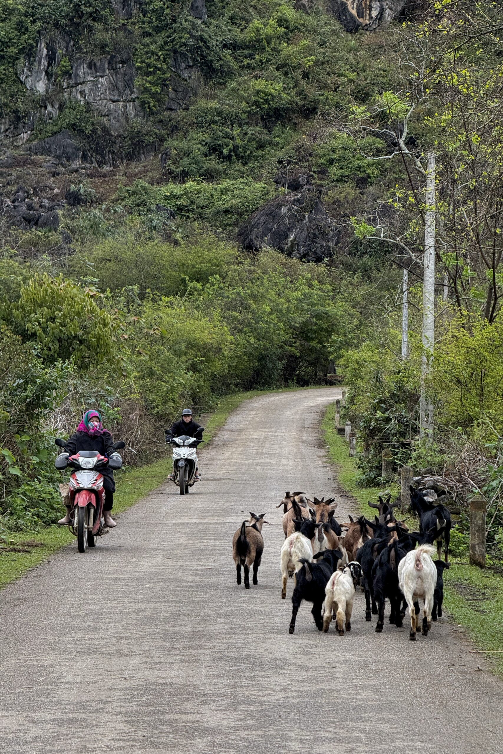 Cao Bằng ist ein deutlich lebendiger Ort als Ba Vì und der Ausgangsort für viele Tagestouren in der Region. Das schlechte Wetter kommt leider mit uns mit, so fahren wir am ersten Tag im Regen Richtung chinesische Grenze. Auch hier ist die Region stark durch die Karstlandschaft geprägt, die Häuser erinnern einem aber eher an das ländliche China und unterscheiden sich stark von jenen im Nordwesten von Vietnam. Wir besuchen eine der vielen Karsthöhlen der Region und bestaunen die riesigen Stalaktiten und Stalagmiten. Die höchste der zusammenhängenden Höhlen ist 60 Meter hoch. Beeindruckende Dimensionen und Formen, die wir in einer 1,5-stündigen Führung bestaunen. Die Nacht verbringen wir direkt an der Grenze und besuchen am nächsten Tag bei schönstem Wetter den wunderschönen Wasserfall, Bản Giốc, der die Grenze zwischen China und Vietnam bildet. Zu unserem Erstauen hat es auf beiden Seiten keine gross sichtbare Militärpräsenz und es fahren von beiden Seiten die gleichen Boote in die Nähe des Wasserfalls.